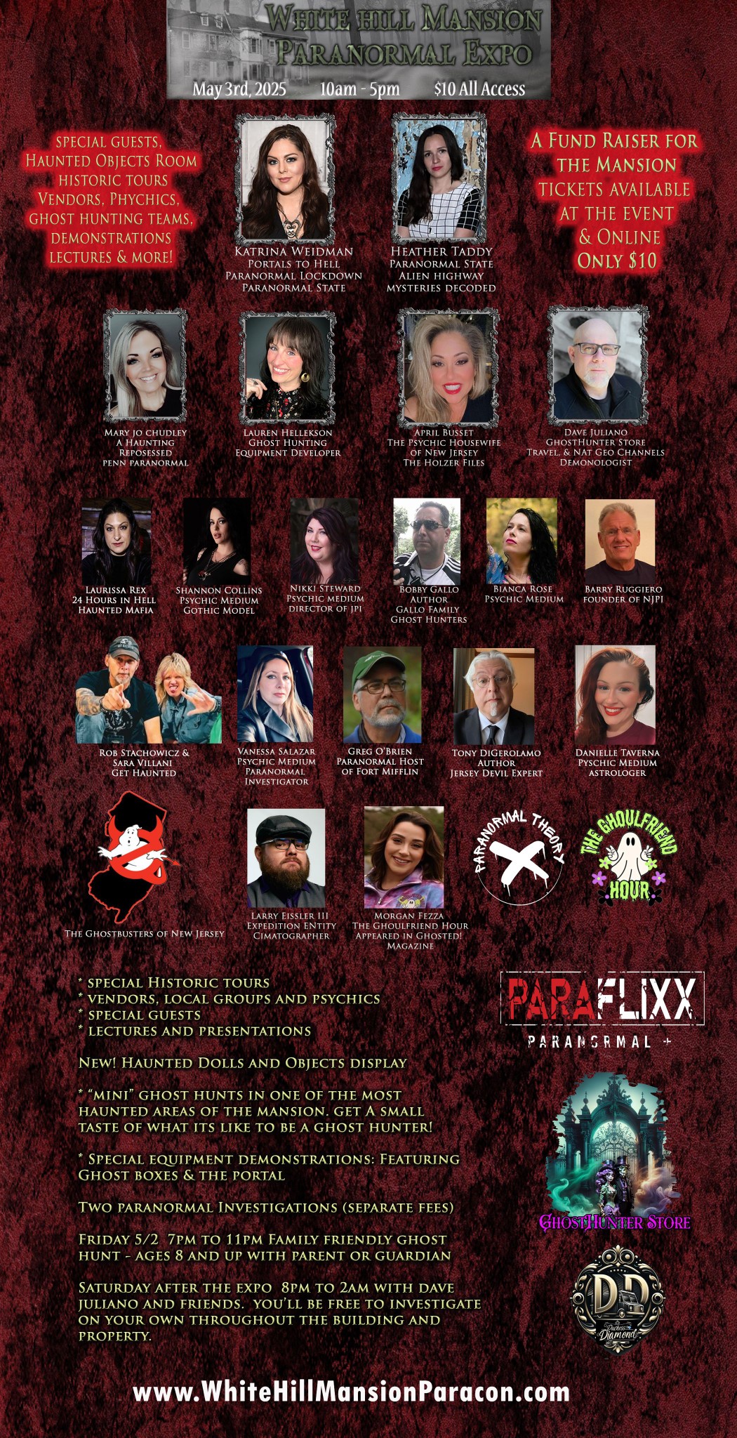 Saturday May 3rd, White Hill Mansion…ParaCon! It is New Jersey’s leading convention of all things paranormal. 35+ vendors, celebrity guests, one of New Jersey’s most haunted locations, and yours truly, The Ghostbusters of New Jersey. That’s right, GBNJ will be on hand to demonstrate our unique brand of professional paranormal investigations and eliminations. Finally some acceptance among the ghost hunting community…and hell maybe we can catch a ghost or two while we are there. So come on down to support New Jersey’s premiere Ghostbusters franchise! and we have merch for sale! Patches, stickers, and pins oh my!